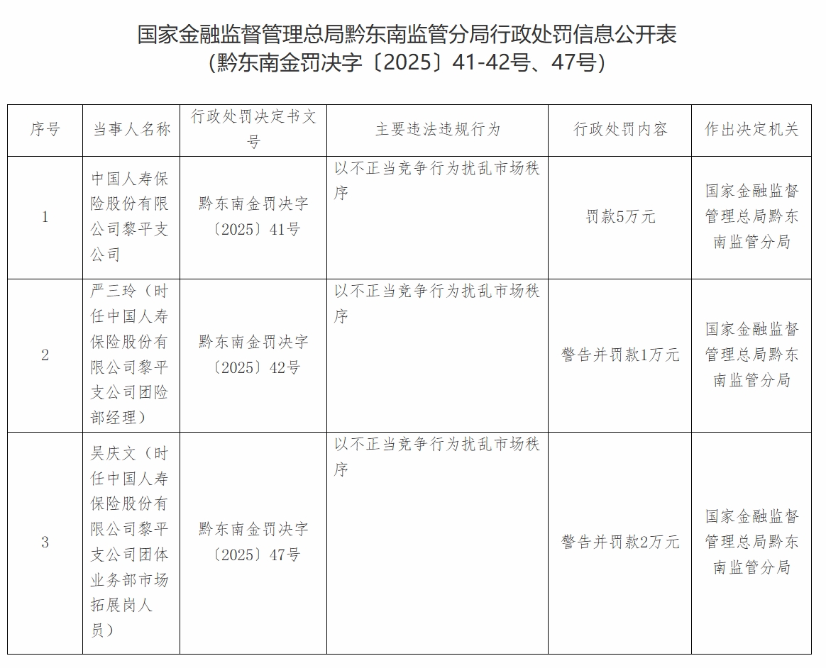 新闻网12月17日消息:近日,中国人寿保险股份有限公司黎平分公司因不正当竞争扰乱市场秩序,被国家金融监督管理总局黔东南监管分局罚款5万元。根据行政处罚决定书,中国人寿保险股份有限公司黎平分公司存在通过不正当竞争扰乱市场秩序的违法事实。具体违规细节并未披露。针对上述违法行为,国家金融监督管理总局黔东南监管分局依法对国寿黎平分公司处以5万元罚款。同时,对严三玲给予警告,并罚款1万元,对吴庆文给予警告,并罚款2万元。 (新网记者)(来源:国家金融监管局黔东南监管分局和行政) (编辑:魏敬亭)