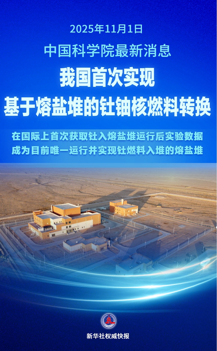 中科院记者11月1日获悉,由中科院上海应用物理研究所牵头的2兆瓦液体燃料熔盐实验堆首次实现钍铀核燃料转换。全球首次获得熔盐堆钍运行后实验数据。它成为目前唯一运行的熔盐反应堆,并在反应堆中实现钍燃料。首次证明了熔盐核能系统利用钍资源的技术可行性,进一步巩固了我国在国际熔盐堆研究领域的领先地位。这是钍基盐堆研发进程中的一个重要里程碑,为为我国未来大规模开发利用钍资源和发展第四代先进核能系统提供基础技术支撑和可行方案。记者:胡哲、张建松 海报制作:胡哲 新华社内部制作